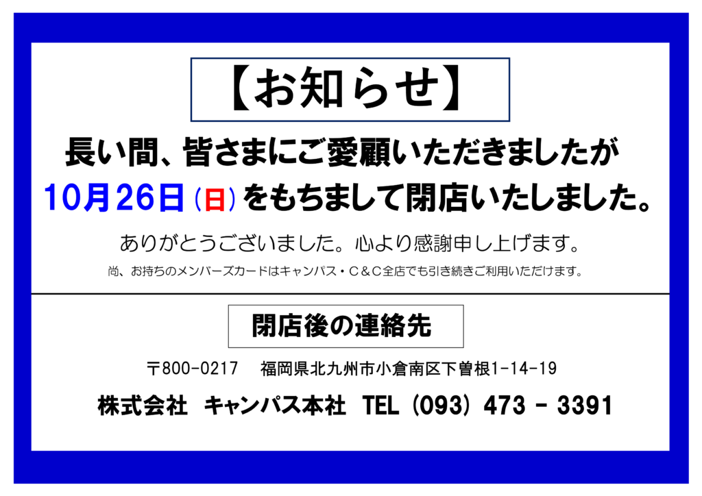わさだ店閉店のお知らせ 2025 10/27 2025年10月27日 いつもキャンパス・C&Cをご利用いただきありがとうございます。この度、10月26日(日)をもちまして、キャンパスわさだ店は閉店させていただきました。 長年にわたり、ご愛顧いただきまして誠にありがとうございました。 お知らせ よかったらシェアしてね! URLをコピーしました! URLをコピーしました!