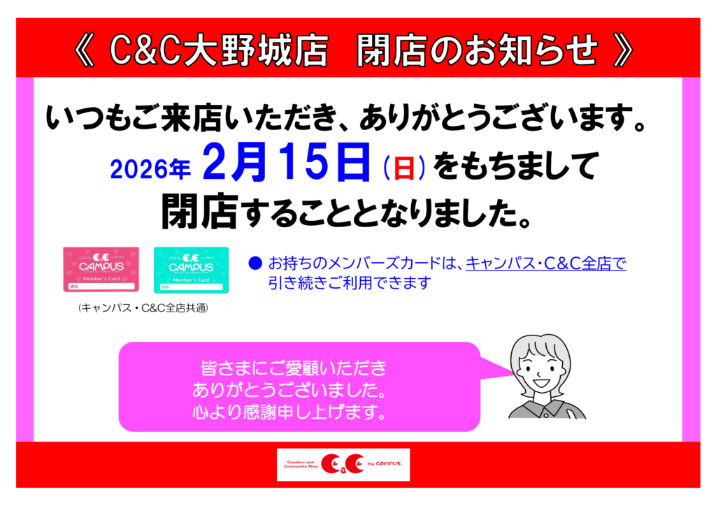 いつもC&C大野城店をご利用いただきありがとうございます。この度、C&C大野城店は2026年2月15日(日)をもちまして、閉店することとなりました。